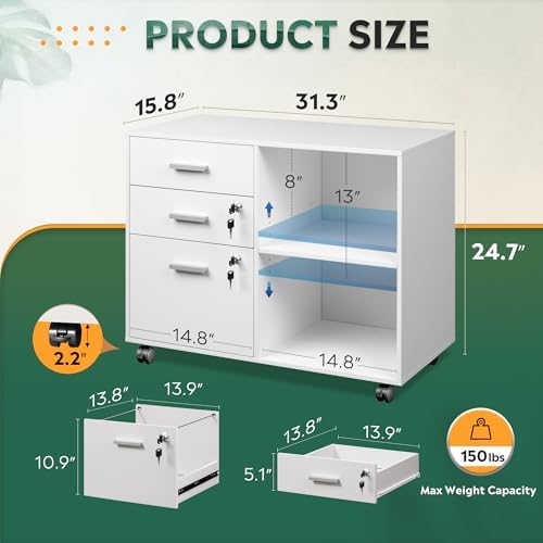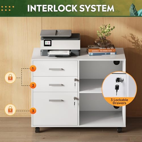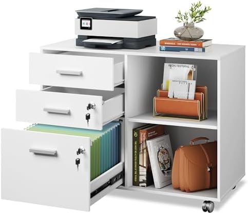 **DEVAISE 3-Drawer Wood File Cabinet with Lock – Mobile Lateral Filing Cabinet and Printer Stand with Open Storage Shelves for Home Office, White**