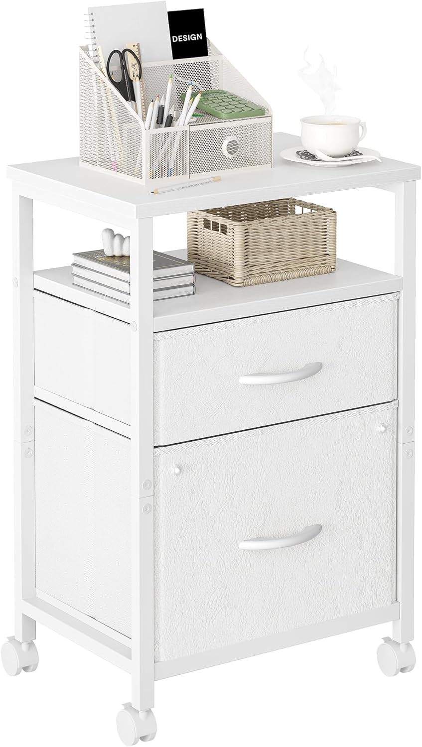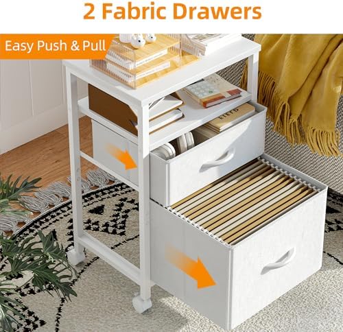 TIQLAB 2 Drawer Mobile File Cabinet, Rolling Printer Stand with Open Storage Shelf, Fabric Vertical Filing Cabinet fits A4 or Letter Size for Home Office, White